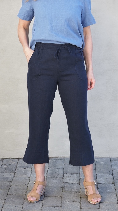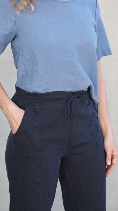 Hommelvik Navy er en. bukse med løst og deilig snitt og lommer som er sydd utenpå. Buksen har ankel-lengde med en bred kant og splitter nederst. Laget i 100% lin med god slitestyrke. Er Hommelvik Navy din nye favoritt denne vår- og sommersesongen?
