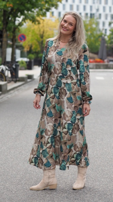 Oppdag den stilige Lindevik kjole Brown-Green, en lang kjole laget av 100% viskose som kombinerer komfort og stil. Denne myke kjolen er designet for å gi en flatterende passform, med et snitt som sitter godt over brystet og et skjørt med fin vidde, perfekt for både hverdagsbruk og spesielle anledninger. Kjolen kan knytes i ryggen dersom man ønsker å stramme den inn i livet.