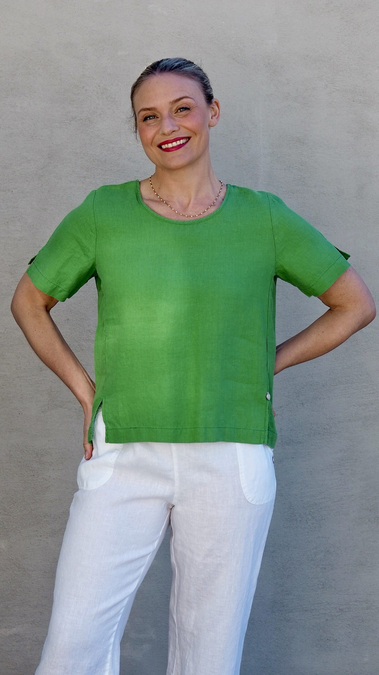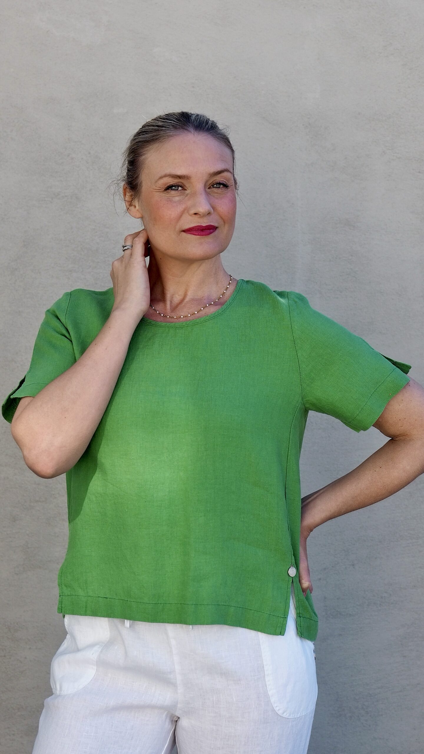 Lykkeland bluse har et unikt snitt og sitter like fint på str XS som str XXL. Blusen har et løst og ledig snitt som er perfeksjonert slik at plagget passer mange ulike kropper. Blusen lages i 100% lin. Plagget er sydd under gode arbeidsforhold. Med gode arbeidsforhold mener vi en lønn til å leve av og ivaretakelse av helse, miljø og sikkerhet. Det innebærer også en kontrakt som sikrer faste arbeidstider samt regulert ferie.