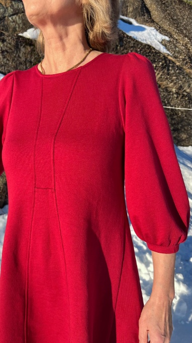 Rosevik deep red er elegant og feminin kjole. Kjolen er knelang og sitter fint over brystet samtidig som den slipper før magen. Stoffet i kjolen er laget av 72% økologisk bomull og 28% tencel.