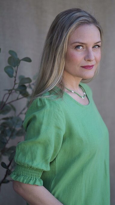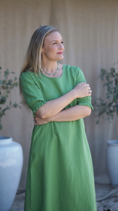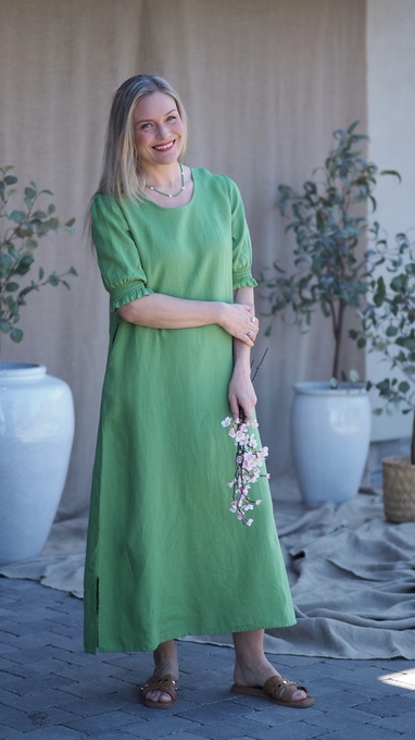 Sandnes Green i lin. Lang kjole med fine puffermer, lommer og et nydelig blomsterprint i glade farger. Er Sandnes Green i lin din nye favoritt denne vår- og sommersesongen?