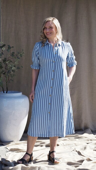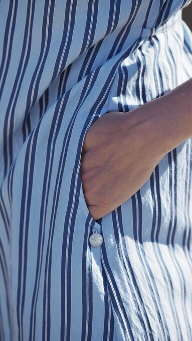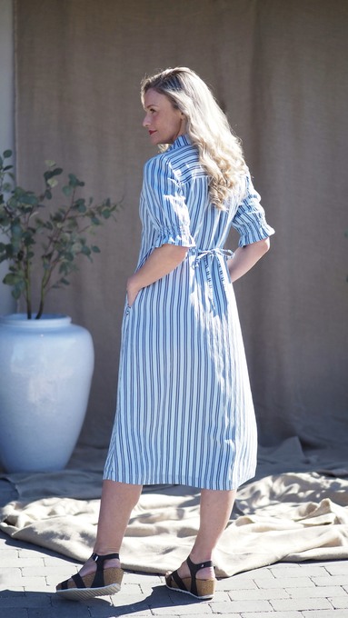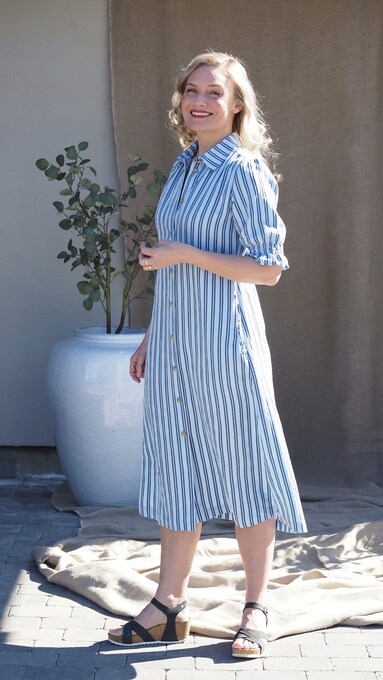 Vega Blue stripes i 90% viskose og 10% polyester. Lang elegant kjole med knepping i front, dekorative gullknapper, lommer og knyting i ryggen – Er Vega Blue stripes din nye favoritt denne vår- og sommersesongen?